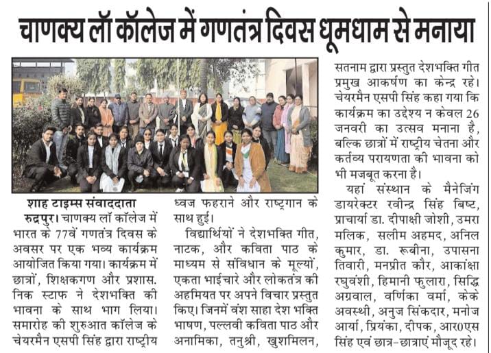 Chanakya Law College, Rudrapur proudly hosted "Hindustan: The Mentor Awards", a prestigious ceremony recognizing excellence in Educational leadership. The event welcomed Principals and Directors from CBSE and Uttarakhand Board institutions. Esteemed dignitaries, Prof. Manmohan Singh Chauhan, Vice-Chancellor of GB Pant University, Dr. J.P. Jaiswal, Director of Communication and shri KS Rawat CEO Udham Singh Nagar graced the occasion as chief guests. Nearly 40 distinguished Principals and Directors of Prestigious Public Schools of Rudrapur including DPS, Bhartiyam, Amenity, GD Goenka , Mount ZEE Litera were honoured for their remarkable contributions to education. The event reflected the college’s commitment to celebrating and promoting academic excellence and mentorship.